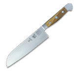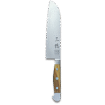 The Alpha Olive Santoku from GÜDE Solingen is adequate for the European chef’s knife. A universal knife is used in Japanese kitchens for almost all cutting work. In contrast to the European chef knife, it has a wider, straighter blade, which is only slightly rounded at the tip. This is due to the chopping technique preferred in Asia. A unique hollow edge ground also prevents food from sticking to the wide blade due to the resulting air cushion.
