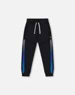 A vertical stripe print adds ultra-sporty style to our Athletic Pants Blue and Black. In stretch recycled poly, these pants feature an easy pull-on fit with a drawstring waistband, front pockets, and angled seams across the thighs. Team with a matching top for a coordinated look he can wear while playing sports or playing games with family and friends!