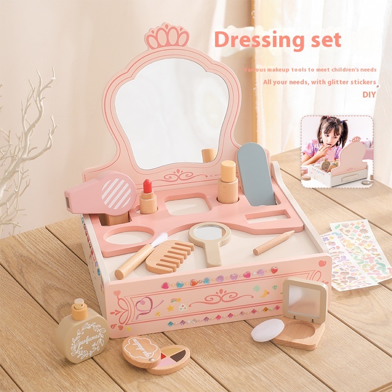 Girl Princess Play House Makeup Toys Small Dressing Table Wooden Children’s Pink Mirror