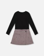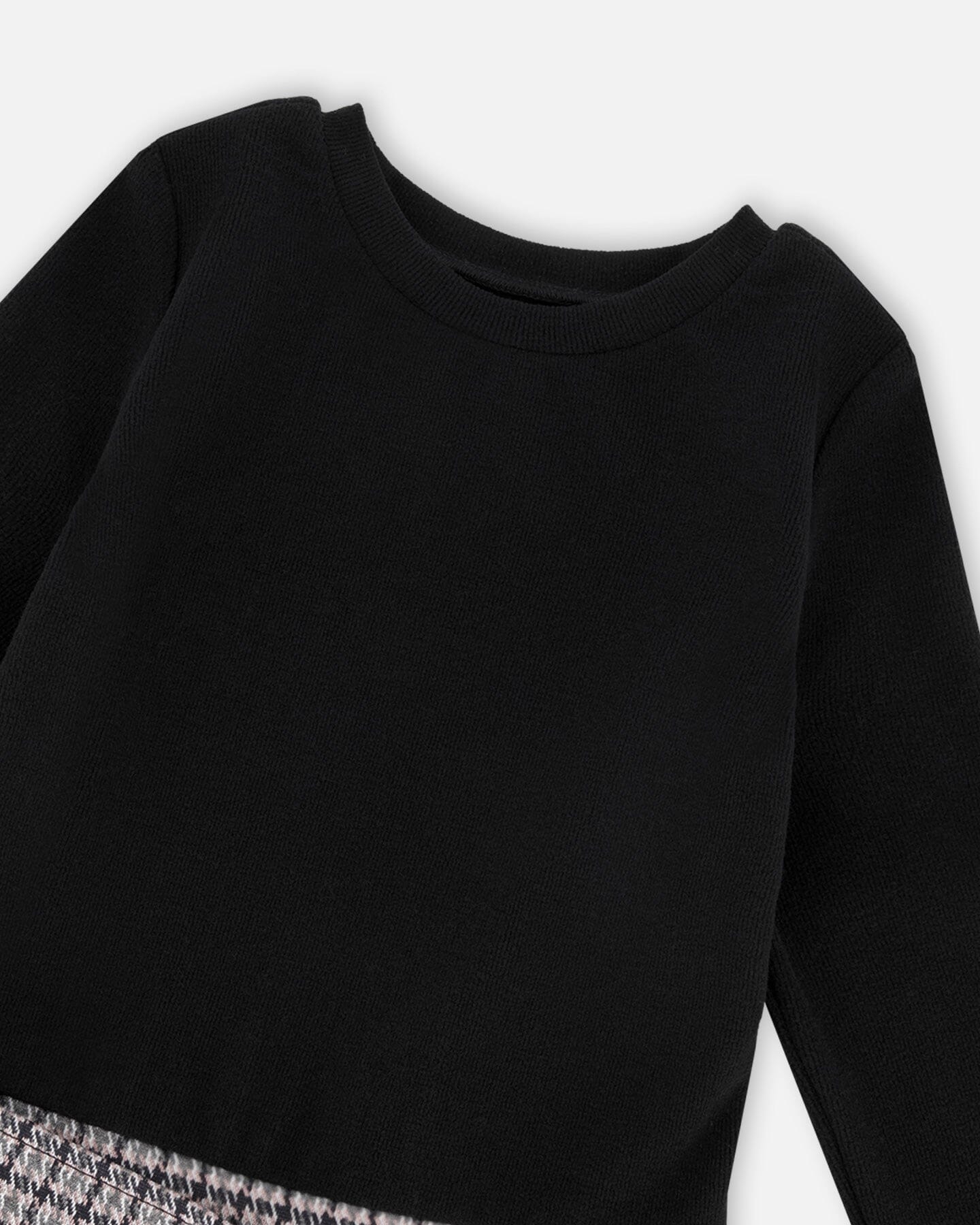 The Bi-Material Dress Black and Houndstooth is a chic statement piece with a clever layered look. This long sleeve dress pairs a brushed rib black top with a textured jacquard knit wrap skirt, complete with a large patch pocket in a classic houndstooth pattern. Soft, stretchy, and cozy, it blends comfort and style for festive outings or everyday flair.