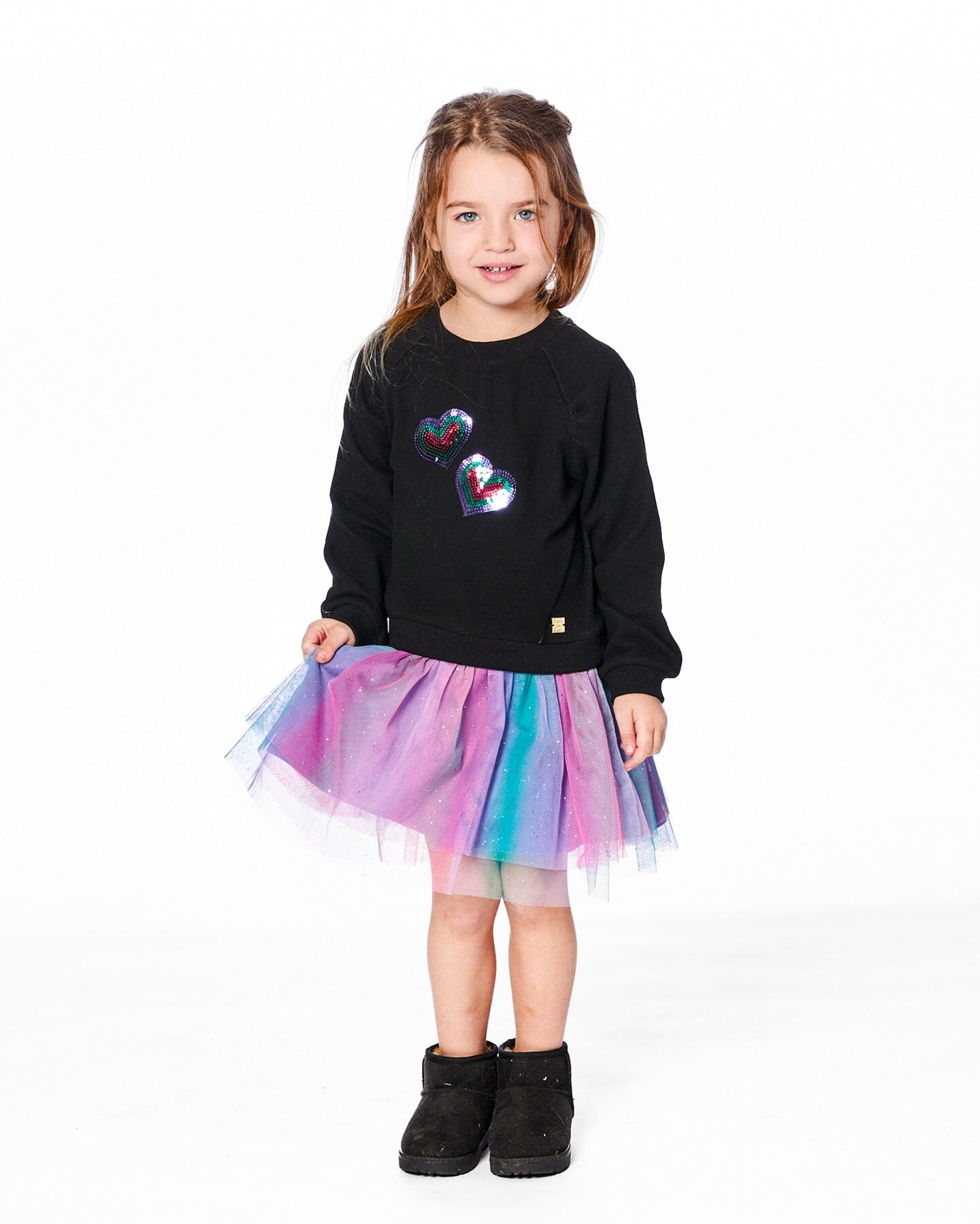 Our Bi-Material Dress Black With Mesh Skirt is a standout piece that blends cozy and magical. This long sleeve sweater dress features a black brushed rib knit bodice with twin sequin heart and a flared multicolor rainbow mesh skirt adorned with tiny gold dots. A soft inner lining ensures comfort while adding volume for twirling fun.