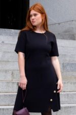 Black A-Line Dress with Gold Button Detail – Cleo by ANNICK APPAREL | Elegant Women’s Clothing for Day-to-Night Style