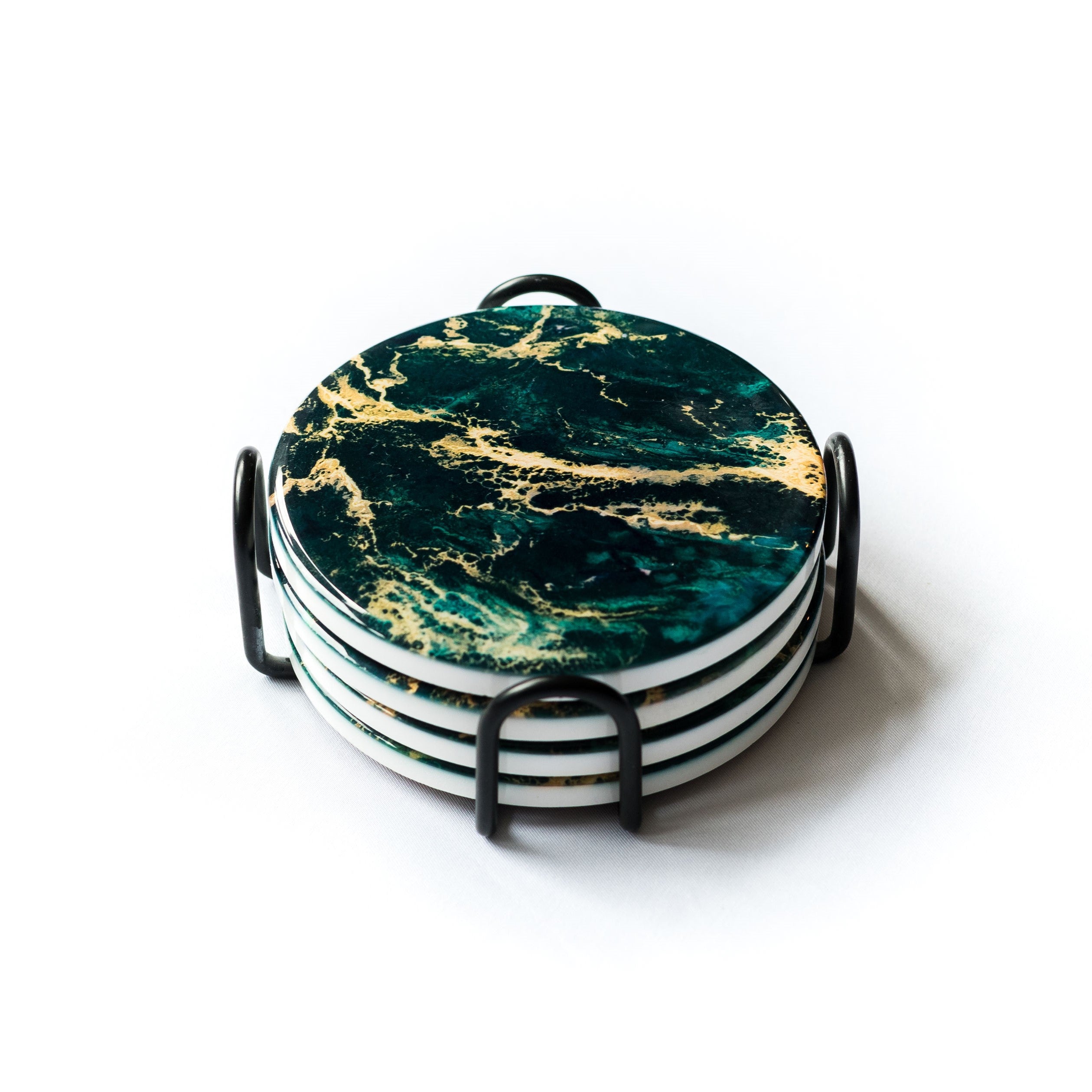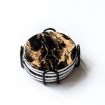 Each set includes four coasters and a black metal holder to keep them organized when not in use.