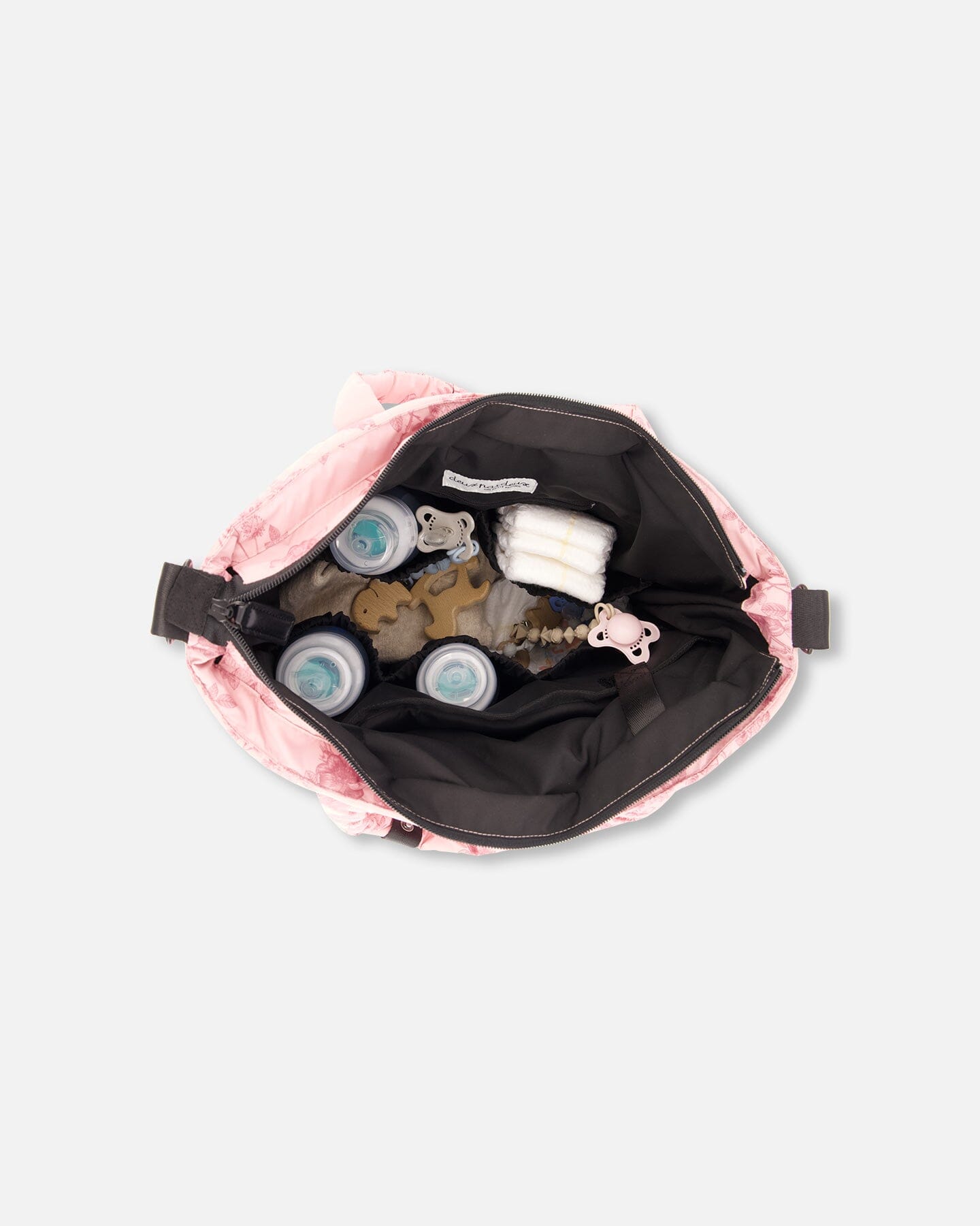 Our Changing Tote Printed Watercolor Roses is loaded with pockets and details to hold all of your mommy and baby essentials. The interior features a large pouch that contains a washable changing pad, elasticized pockets to hold baby bottles and food, and a zipper pocket to hold small accessories. The outside is detailed with a front zipper pocket, top handles, a detachable shoulder strap, and small detachable straps to attach to your stroller.