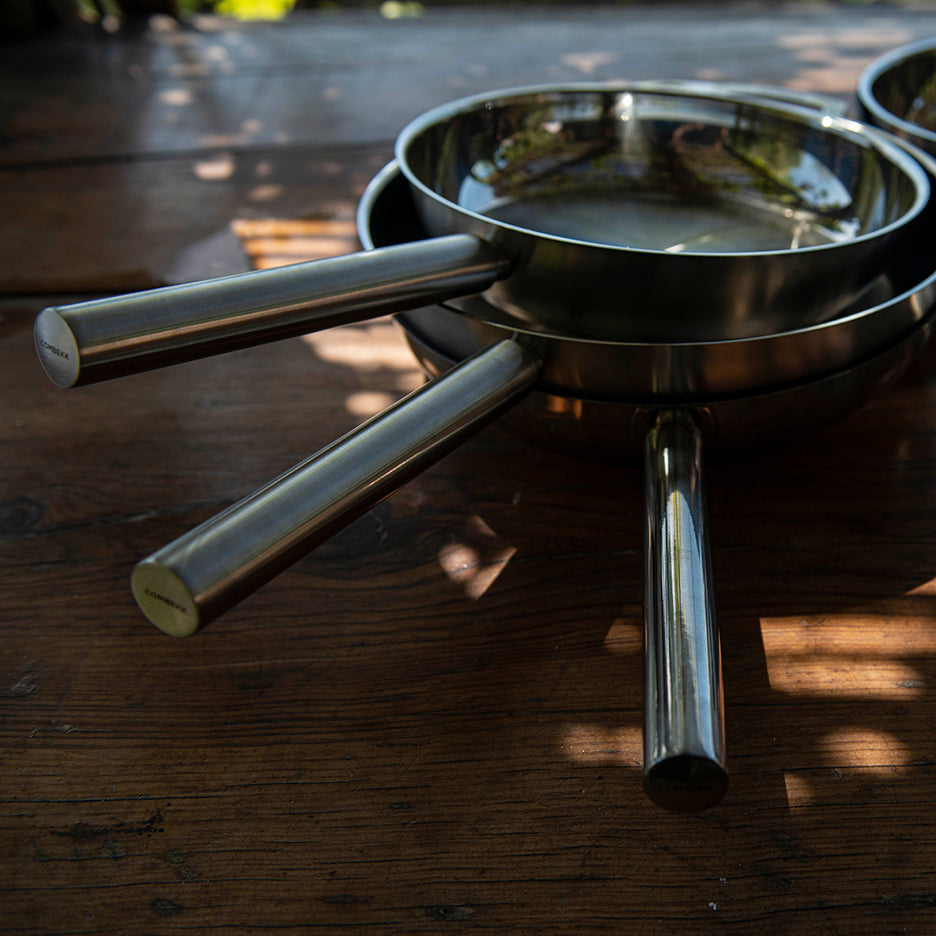 Elevate your kitchen essentials with the COMBEKK Stainless Steel Fry Pan Set, where high performance meets elegant design, offering durability and sustainability in every culinary creation.