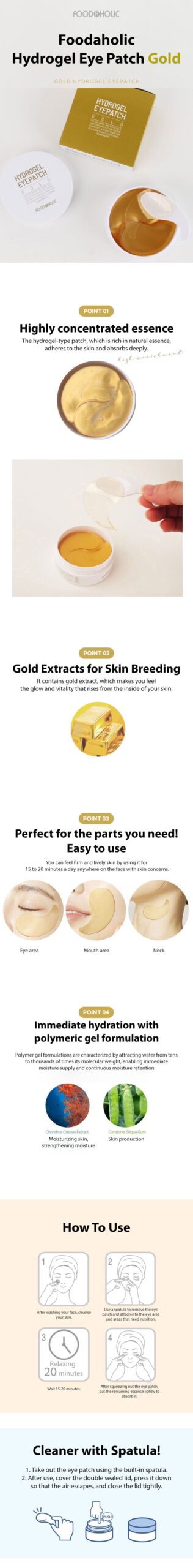 The Foodaholic Hydrogel Eye Patch – Gold is a luxurious skincare solution designed to provide deep hydration and a radiant glow to your skin. This product stands out for its high concentration of natural essence and its unique hydrogel technology.