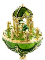 This exquisite trinket box by Keren Kopal captures the elegance of a garden pavilion in miniature form. Designed in the shape of an ornate egg, it features a sculpted cupola with a delicate fountain at its peak, evoking the charm of a serene garden scene. Crafted with intricate details and vibrant hand-painted enamel, this collectible box is both a decorative keepsake and a functional treasure holder, ideal for gifting or displaying in a refined collection.
