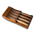 The Ginza Steel AMELIA Five set includes four 5-inch steak knives crafted from VG10 Damascus steel for exceptional sharpness and durability. Presented with a stylish wood block, this set is perfect for elegant dining and precise cutting.
