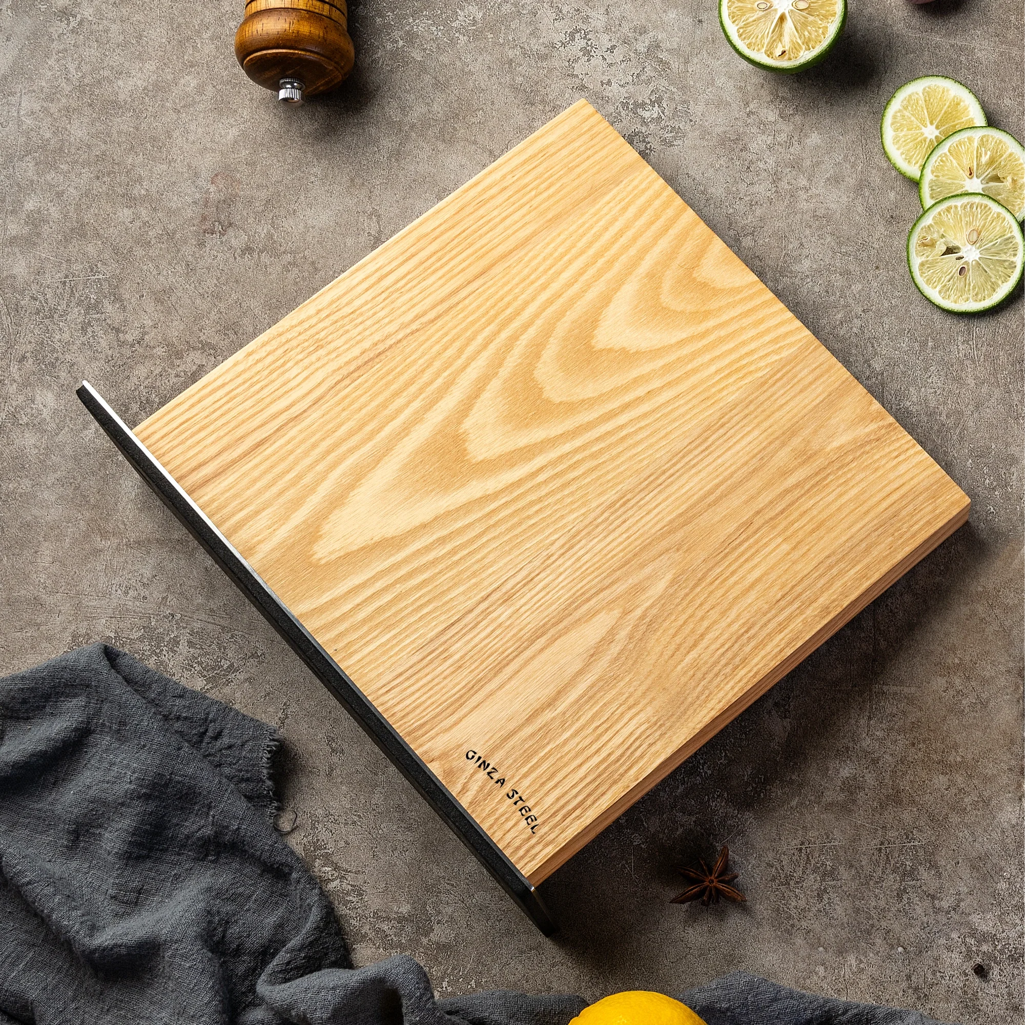 The Ginza Steel Magnetic Wood Knife Block combines natural beauty with smart functionality, making it an essential storage solution for any kitchen. Crafted from premium ash wood and supported by a sleek metal base, it uses strong internal magnets to securely hold knives in place while keeping them visible and within reach.
