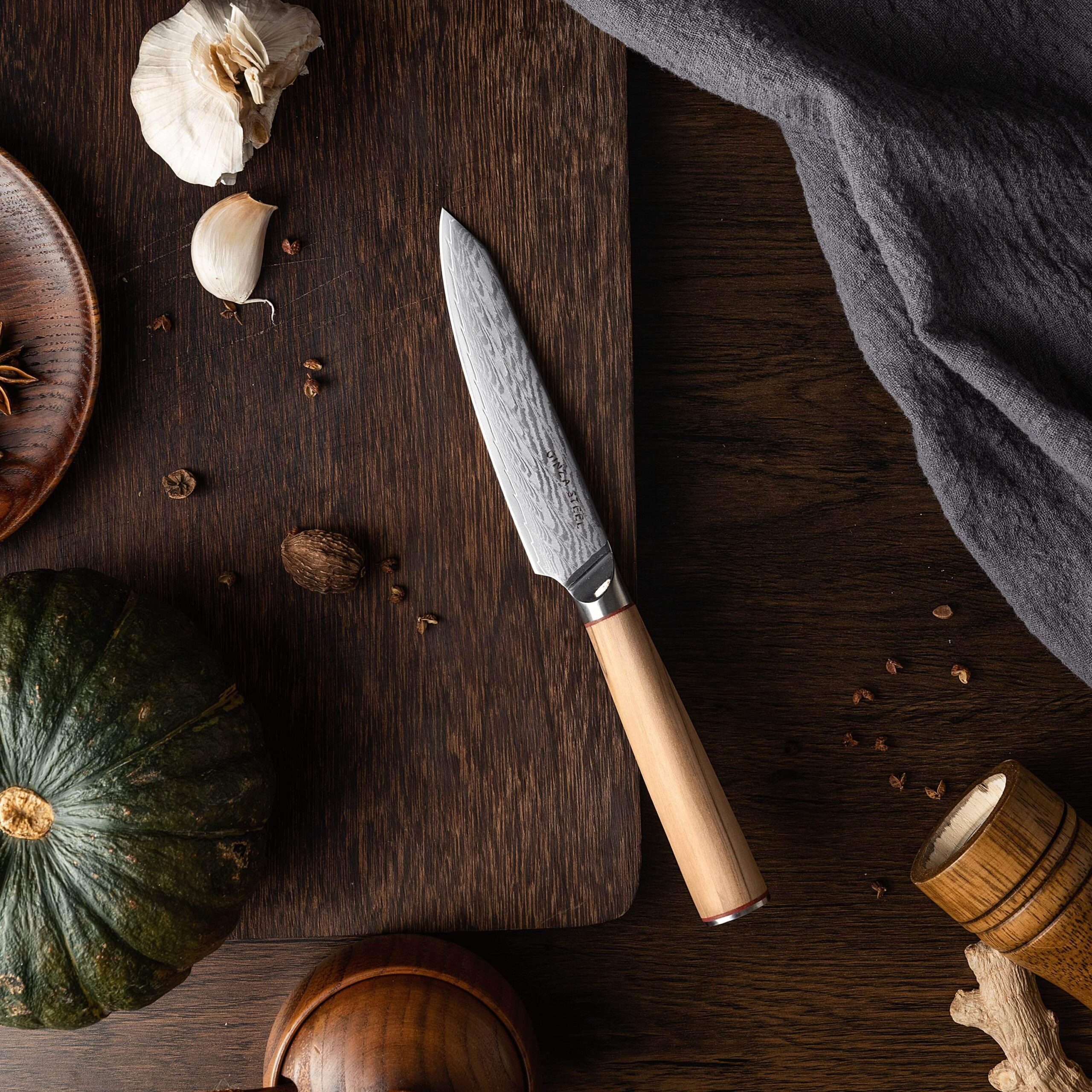 Ginza Steel MIA 12 Utility Knife 5” – Damascus AUS10, 67-Layer, Olive Wood Handle