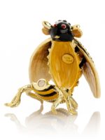 Bring a touch of royalty to your collection with this exquisite Honey Queen Bee Trinket Box. Crafted with shimmering gold-tone metal, this beautifully detailed keepsake features vibrant black and yellow enamel, sparkling crystal accents, and delicate wing textures. The hinged design opens to reveal a small hidden compartment, perfect for storing tiny treasures, jewelry, or keepsakes. A charming gift for bee lovers, collectors, or anyone who appreciates elegant craftsmanship.