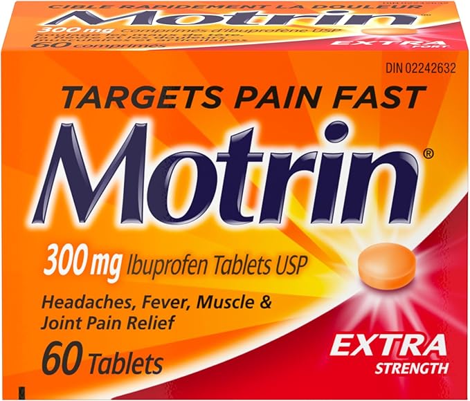 Motrin Ibuprofen, Extra Strength Tablets, Pain Reliever for Menstrual Pain, Back Pain, 300mg, 60 Tablets, orange