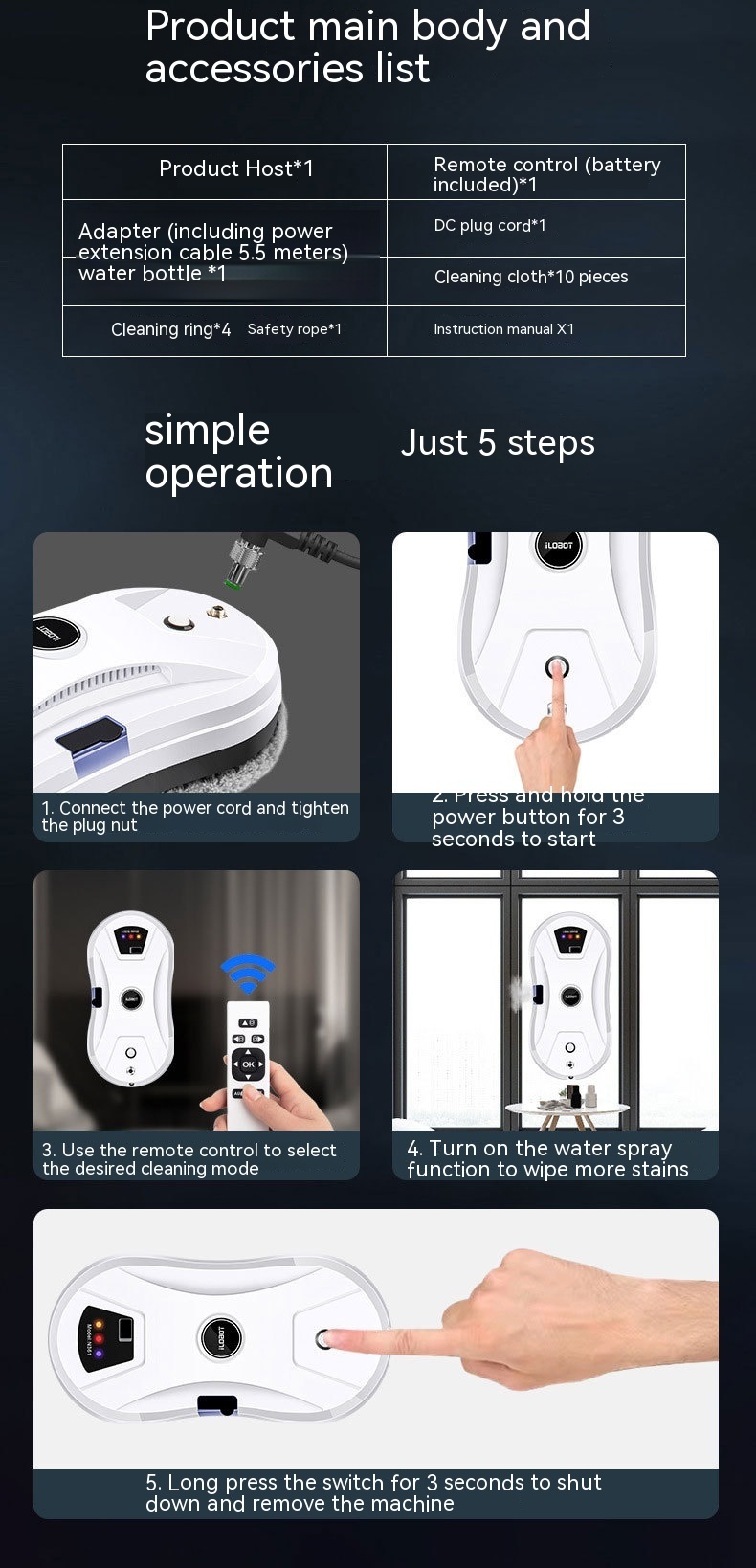 Product host * 1+Remote control (including battery) * 1+Adapter (including 5.5 meters power extension cable)+DC plug cable * 1+Water injection bottle * 1+Cleaning cloth * 10 pieces+Cleaning ring * 4+Safety rope * 1+User manual x1