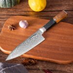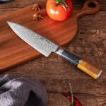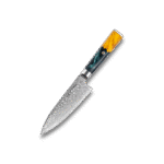 The handle, crafted from stabilized wood and green resin, provides superior comfort and control, making it an ideal choice for both professional chefs and culinary enthusiasts. Accompanied by a stylish wood sheath, this knife seamlessly combines functionality and sophistication, elevating your culinary experience to new heights.