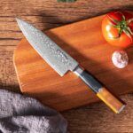 Discover the perfect blend of precision and elegance with the Ginza Steel Kaze Katana Chef Knife. Featuring a 15cm blade forged from VG10 Damascus steel, this knife is renowned for its sharpness and exceptional edge retention. The hammered blade design minimizes friction, ensuring smooth and effortless cutting.