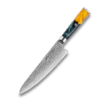 The handle, crafted from stabilized wood and green resin, provides unmatched comfort and control, making it a perfect choice for professional chefs and home cooks alike. Paired with a stylish wood sheath, this knife effortlessly combines functionality and sophistication, offering an unparalleled culinary experience.