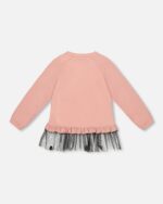The Long Bi-Material Top Dusty Pink With Mesh Ruffle Hem and Leopard Print brings fun and flair to everyday dressing. This long t-shirt is made from soft organic cotton jersey with a lightweight mesh ruffle hem at the bottom, raglan sleeves, and a dazzling leopard graphic on the chest. With its extended length and flouncy finish, it’s perfect for pairing with leggings for a playful yet polished look.
