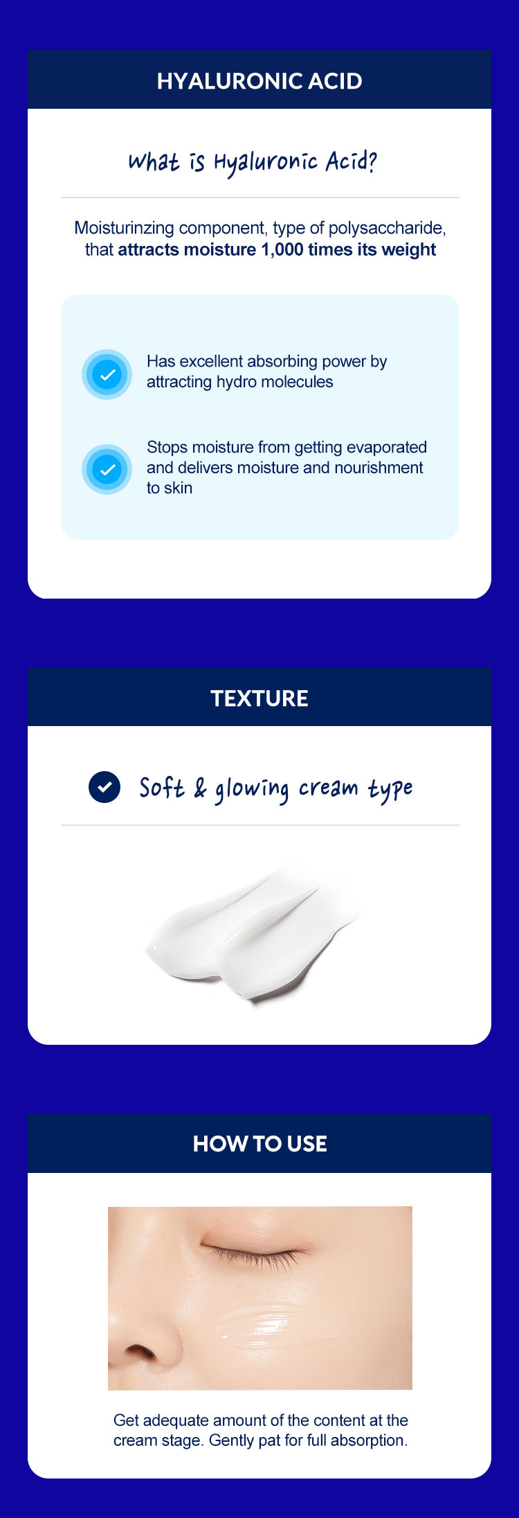 - 10-Type Hyaluronic Acid Complex: The cream contains a blend of low, medium, and high molecular weight hyaluronic acids, working in synergy to hydrate the skin at multiple levels.