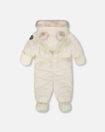 With car seat compatibility so it’s easy to buckle little ones in, our BABY LAYETTE winter suit in white asparagus is waterproof, breathable, dirt-repellent, and designed for warmth in temperatures as low as -30°C (-22°F). A sherpa-lined hood, a velour-lined body, velour-lined booties, and a chin guard offer added warmth, while an adjustable inside waist makes it possible to get the perfect fit.
