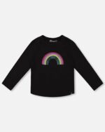 Our Organic Cotton Long Sleeve T-Shirt in Black With Sequin Rainbow brings a playful shimmer to everyday wear. This long raglan sleeve tee in stretch jersey is adorned with a sequin rainbow for a magical, textured finish, and has a round neckline. Pair it with leggings or joggers from our “Let’s Dance!” collection to complete her sparkly adventure.