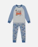 Make bedtime the cutest moment of the day with our Organic Cotton Long Sleeve Top and Pants Two-Piece Pajama Set Tools on Bluish Gray Background. This adorable pajama set features a long sleeve top with contrast raglan sleeves, a graphic toolbox print on the chest, and an elastic waist pant with an allover tool print.