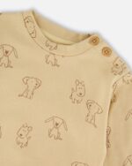 Your little one is ready for a playful day in our Organic Cotton Pant and Top Set in Beige Printed Dogs! The soft cotton sweater features long sleeves and a super cute allover dog print, while the pants with an elastic waist make sure your baby stays comfy and stylish all day. The practical buttons at the shoulder make getting dressed a breeze. Made from cozy interlock fabric, this set is perfect for your baby boy’s fun-filled adventures!