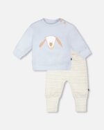 Your little one is ready for a playful day in our Organic Cotton Pant and Top Set in Light Blue ! The soft cotton sweater features long sleeves with a super cute dog print on the chest, while the coordinated striped pants with an elastic waist make sure your baby stays comfy and stylish all day. The practical buttons at the shoulder make getting dressed a breeze. Made from cozy interlock fabric, this set is perfect for your baby boy’s fun-filled adventures!