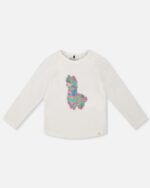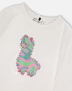 Our Organic Cotton T-Shirt Off White With Llama is soft, comfy, and full of llama magic. This long sleeve top features raglan sleeves, a round neckline, a curved bottom hem, and a shiny metallic llama print for added charm. It’s a playful and easy t-shirt for school days or weekend adventures.