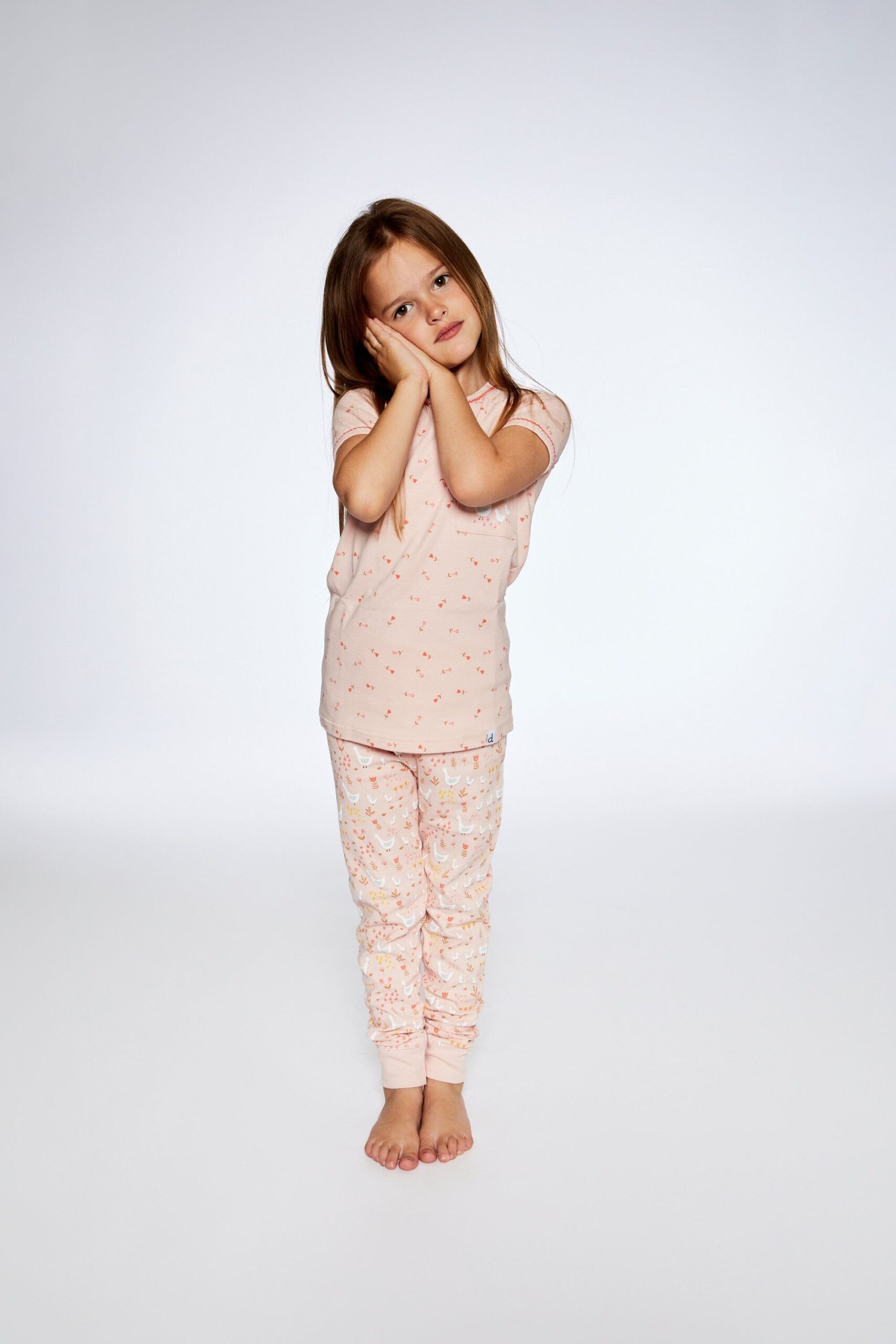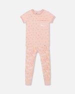 A geese and flower print adds natural charm to this lightweight pajama set. Our Organic Cotton Two Piece Pajama Set Pink Printed Goose is oh-so-sweet with a short sleeve crew neck top and an elastic waist pajama pant. Both pieces feature a pretty allover print with a patch pocket on the top and contrast cuffs on the bottom.