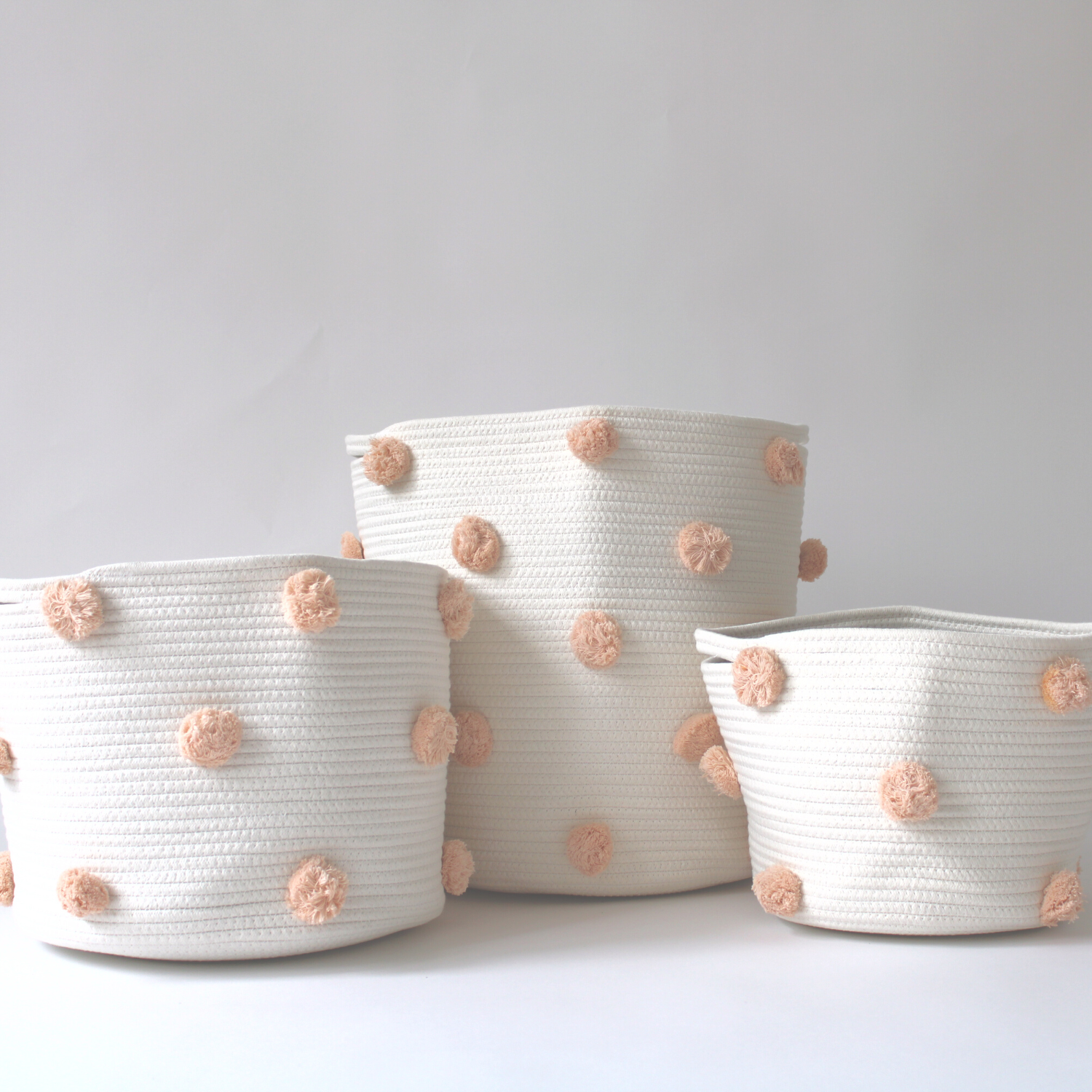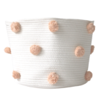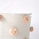 The Peach Pom basket is the perfect addition to any room in your home. With endless possibilities, this basket can be used in so many ways. Store books and magazines, rolled up bath blankets, or – even your little one’s toys. Hide the clutter without sacrificing style. Each basket features 18 hand-dyed poms in a cheery shade of peach.
