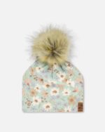 2par2 | Designed in Canada, Printed Jersey Detachable Pompom Hat Small White Flowers On Turquoise And Lilac