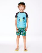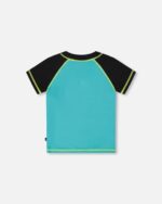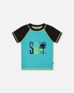 Neon stitches and prints add bold, bright style to our Short Sleeve Rashguard Black and Turquoise. Offering UPF 50+ sun protection, this colorful rashguard features short raglan sleeves, a round neckline, a surf and palm tree print on the chest, and contrast topstitching at the neck, sleeves, and hem.