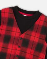 Our T-Shirt With Plaid Vest Red and Black offers a smart layered look without the fuss. Made from soft jersey with a woven plaid overlay, this stylish top features long sleeves, a crew neckline, and a mock buttoned vest sewn onto the front. It’s the perfect mix of comfort and charm for festive gatherings or dress-up days.